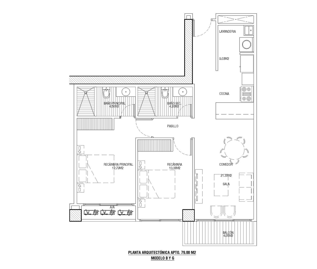 Modelo B y G de 79 m2 con dos (2) recamaras, dos (2) baños, dos (2) estacionamiento, cocina abierta, sala comedor, balcón y área de lavado.