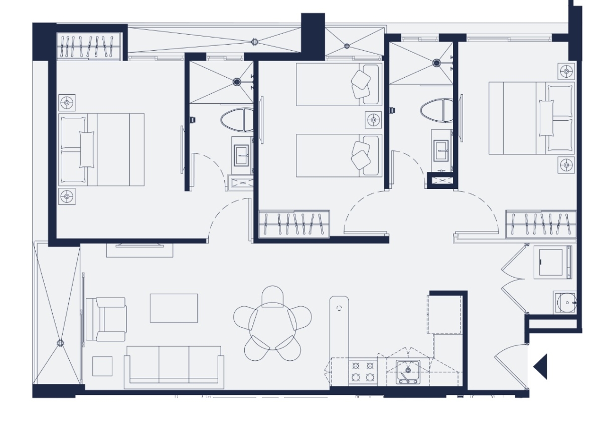 Modelo C de 89 m2: con tres (3) recámaras, dos (2) baños, cerradura inteligente, recibidor, cocina con estufa y horno empotrable, sala, comedor, cuarto de lavado y balcón.