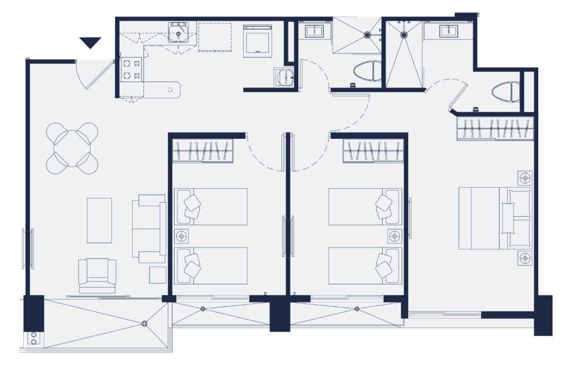 Modelo C de 89 m2: con tres (3) recámaras, dos (2) baños, cerradura inteligente, recibidor, cocina con estufa y horno empotrable, sala, comedor, cuarto de lavado y balcón.