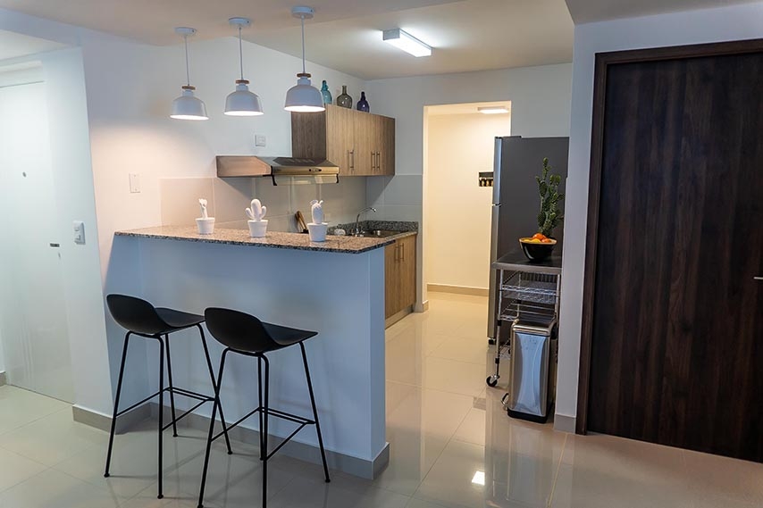 Apartamentos de 50.98 m2: Una (1) recámara con closet, espacio para la segunda recámara la cual se la entregamos sin costo alguno y le incluimos el closet, un (1) baño, sala-comedor, cocina abierta y área para lavandería.