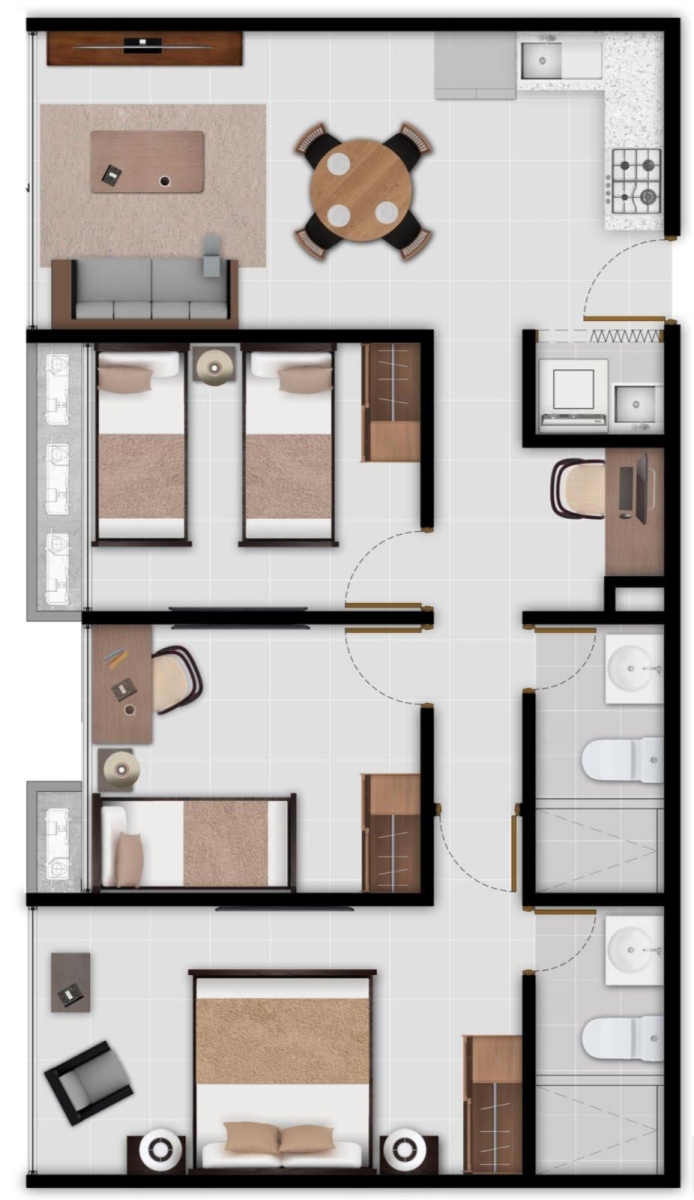 Opciones de tres recamaras con dos baños. Sin balcón Escríbenos para mas información y agendar una cita.