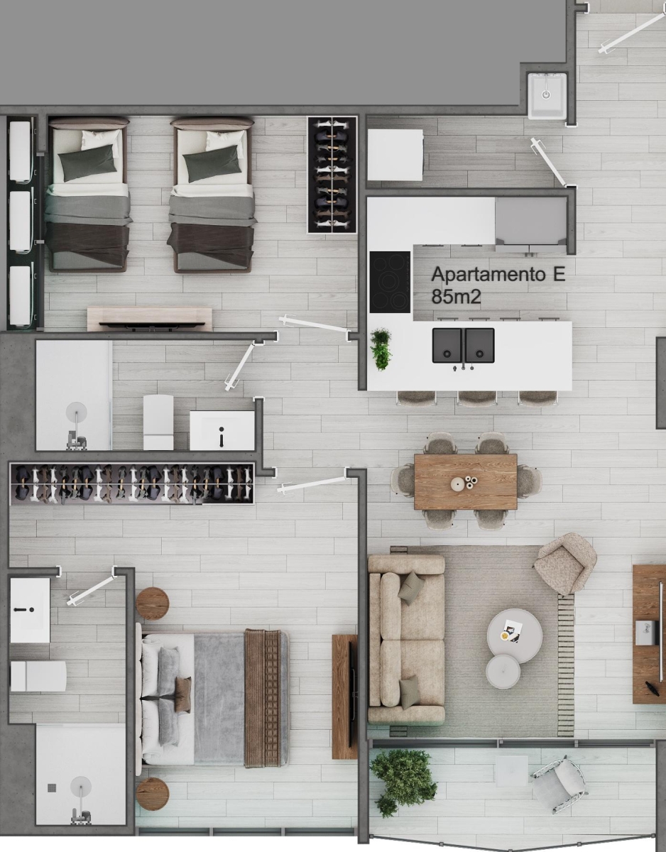 Este modelo combina amplitud y funcionalidad. Su sala y comedor se integran de manera fluida con la cocina, generando un ambiente social ideal. En AURA Obarrio, cada detalle está pensado para la comodidad: su arquitectura contemporánea, el acceso controlado y las áreas sociales ofrecen una experiencia residencial moderna y segura.