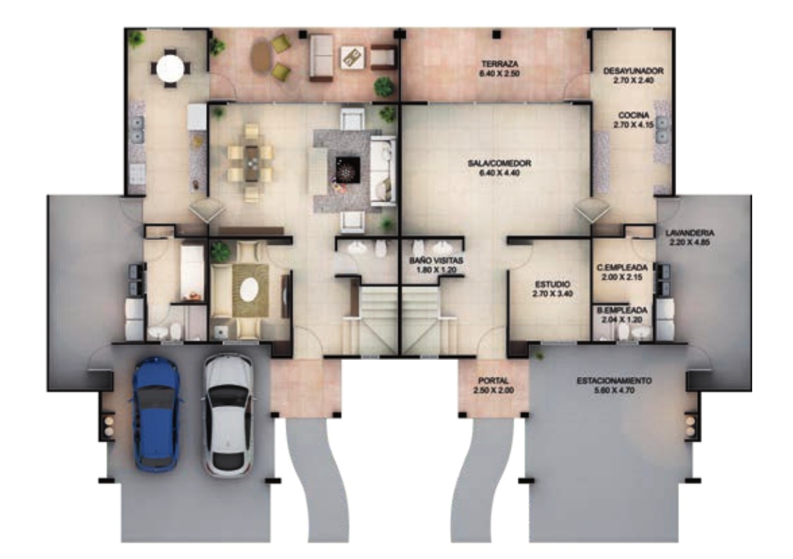 PLANTA BAJA: Cocina con desayunador, baño de visitas, sala / comedor, un (1) estudio, lavandería, cuarto y baño de servicio y terraza.